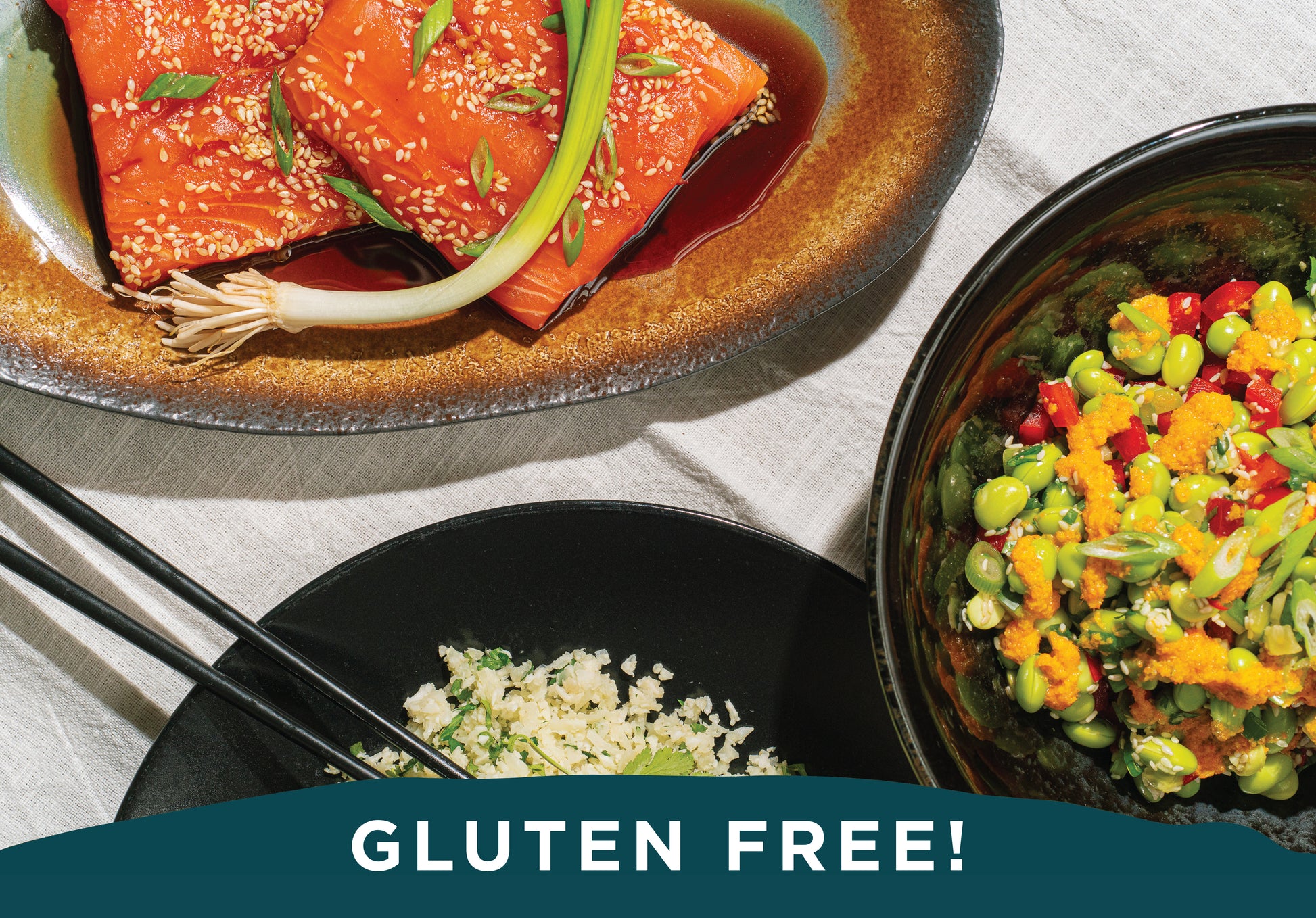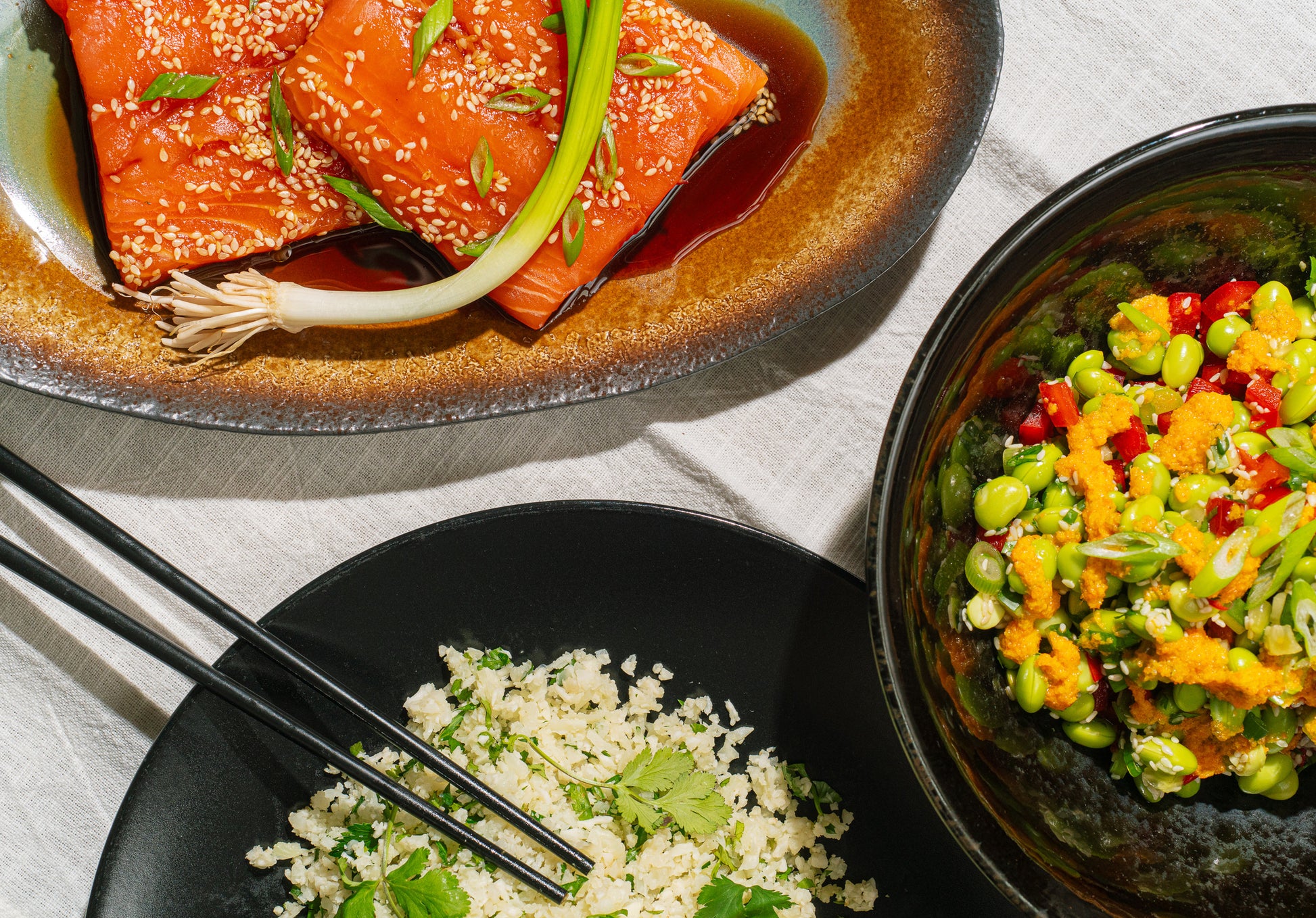 Domo's gluten-free teriyaki salmon with sides of edamame salad & cauliflower rice. Heart-healthy & Keto!